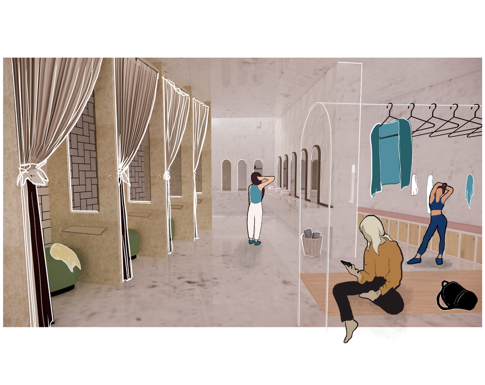 When tasked with finding a theme to define this bold line between self and others, I decided on Validation. As one person often relies on the validation of themselves to succeed and find their love of life. This comes from self confidence or the reassurance in relationships we have with others. Maintaining self image and self love can be a key contribution to confidence. Physical appearance came to mind a lot, and with it, mirrors, the act of looking at oneself in the mirror to feel fulfilled and proud of the reflection. And so the idea of this zone became a fitness zone and health food bar, in order to promote the importance of physical well-being, be it via exercising or nourishing oneself with good food.