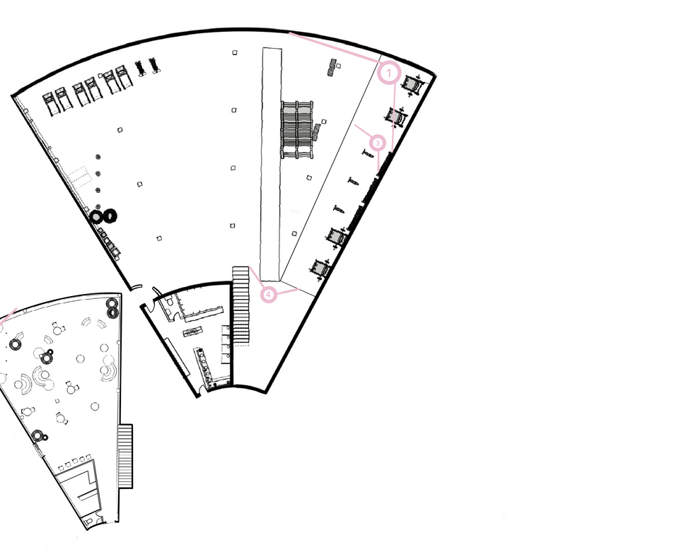 A space to strengthen and balance. The first zone, inspired by the 1st and 7th Zodiac archetypes Aries and Libra. The theme of validation became a space for physical well-being and learning how to stay healthy, both with how you exercise and how you feed yourself. The space promotes activity, individual and shared experiences of strengthening and balancing the body. This open plan gym space allows generous room for physical activity, free-weight lifting and machine training. It also features facilities for functional training and circuits. The mezzanine level has a health food bar offering post-workout fuel for the body and a space to socialise and gain fulfilling interaction with those who have similar interests in sport or activity. The north facing panoramic window offers views to the treetops and sky allowing floods of natural light but no direct sunlight which would heat up the space uncomfortably for the gymnasium.